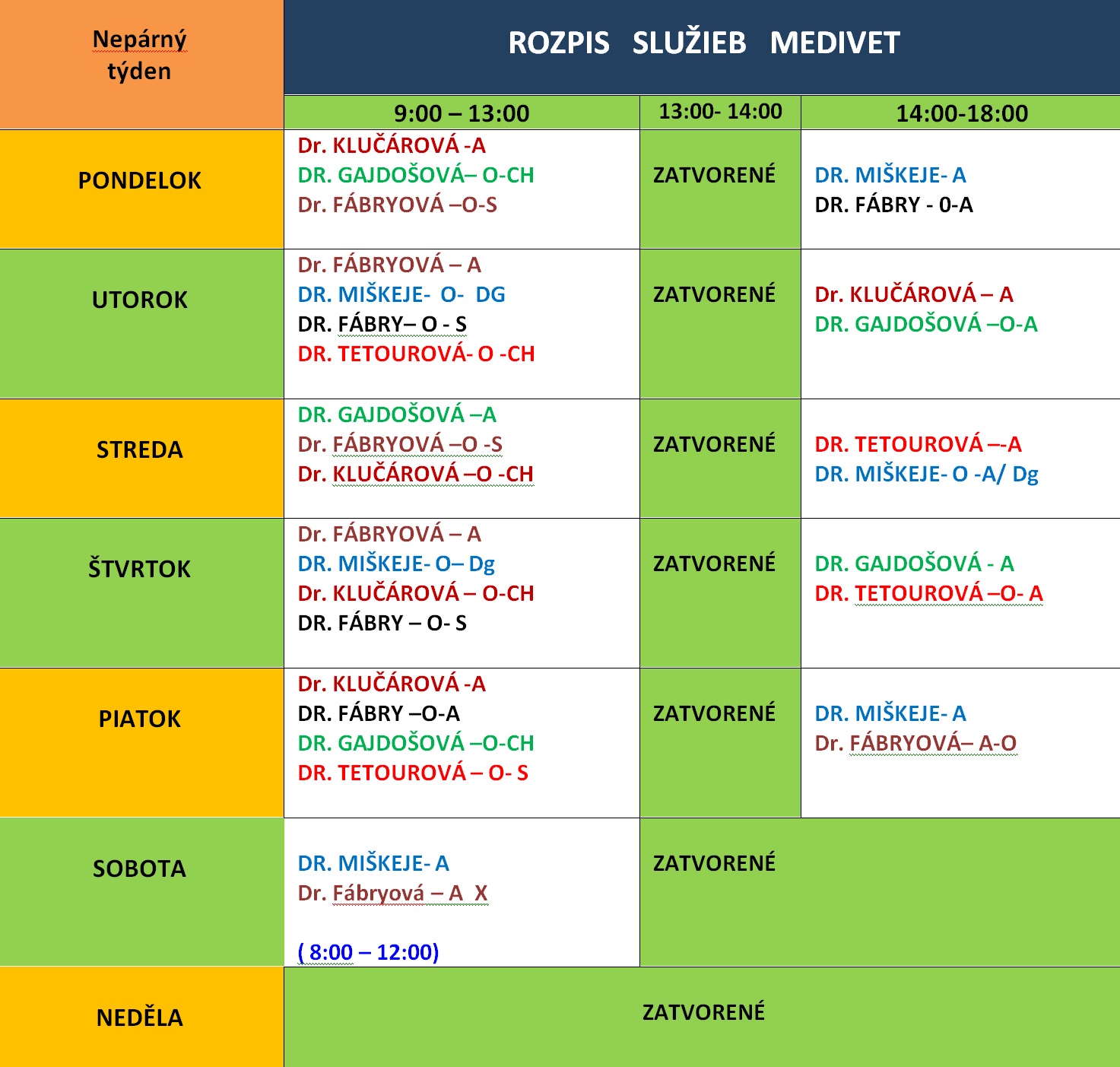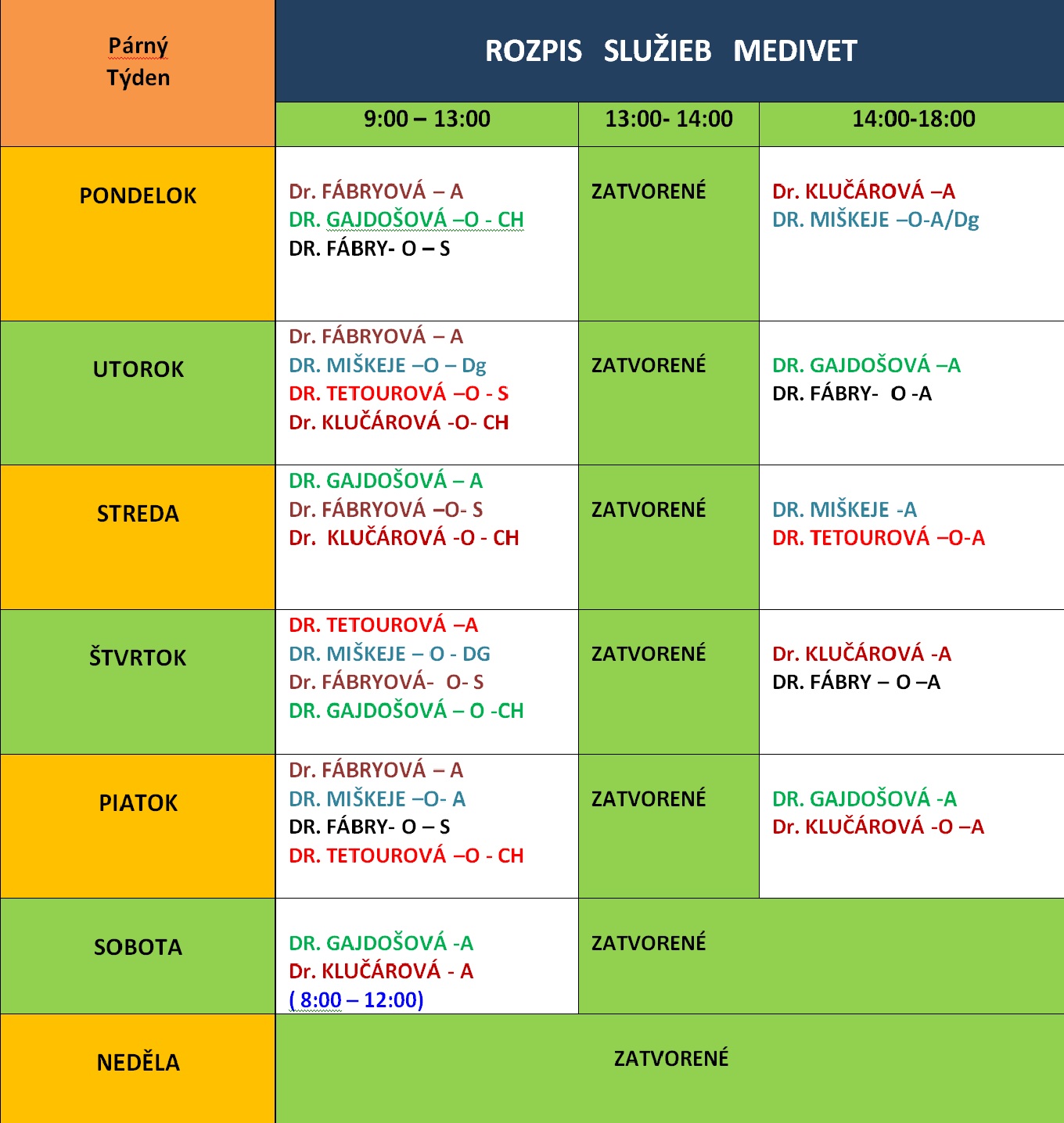 Klinika pracuje v objednávkovom režime, ale zároveň vždy jedna ambulancia je k dispozícii bez objednania. V rozpise si môžete pozrieť ktorý lekár v daný deň má službu, ku komu sa môžete objednať a kto vám bude k dispozícii v ambulancii ( A- ambulancia, O-objednávky)